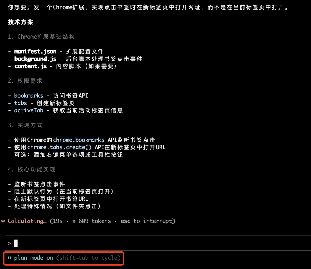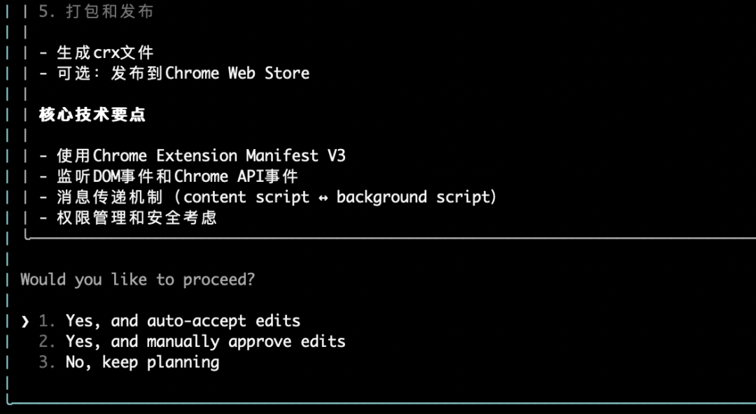 在项目前期需要规划功能的时候可以用到这个模式,它会自动给到计划方案,然后底部你是否执行: