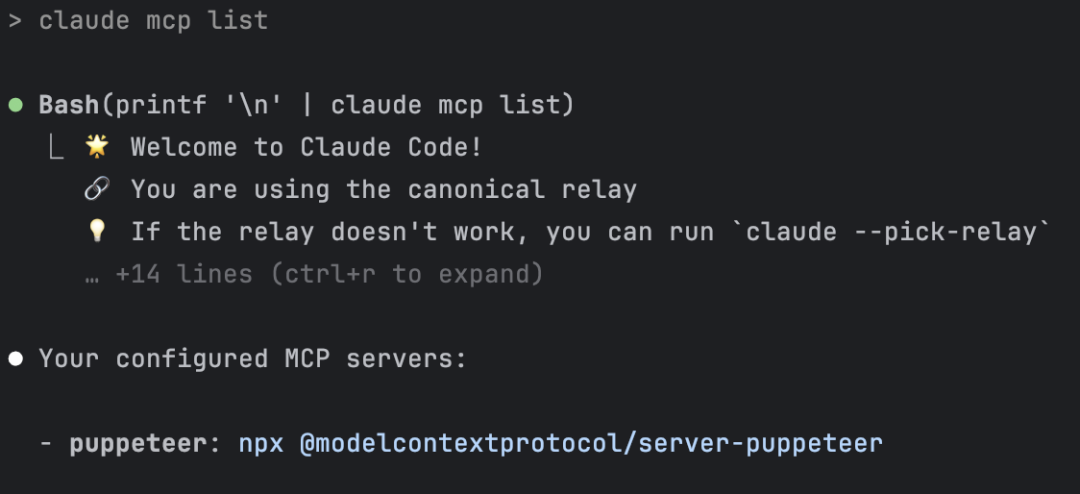 claude mcp add puppeteer npx -- -y @modelcontextprotocol/server-puppeteer通过 JSON 方式添加: