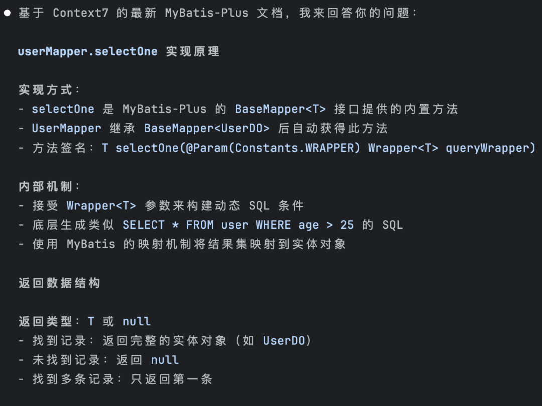 如图,它会告诉你使用 Context7 相关工具来获取 MyBatis-Plus 的最新文档来回答问题。