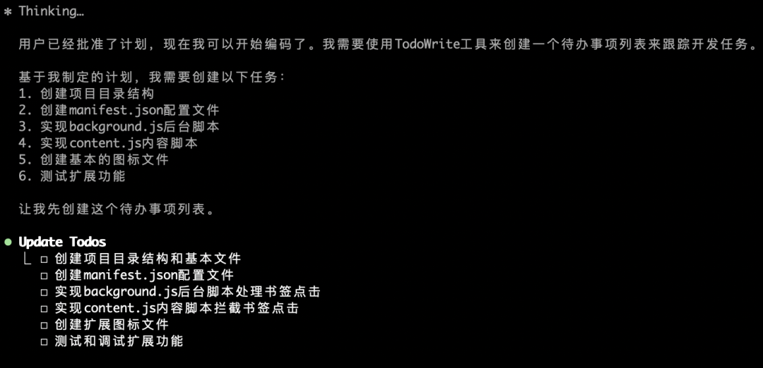 如点击第一个选项 Yes, and auto-accept edits,它就会进入「自动接受编辑」模式,根据 todo list 完成所有之前规划的功能。
