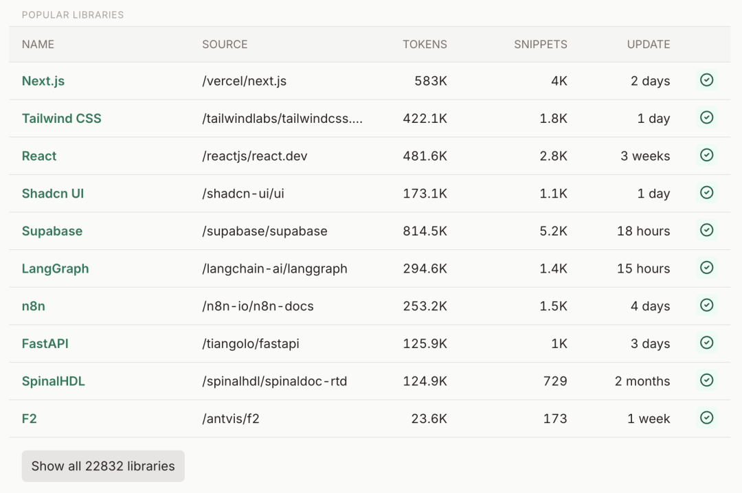 它可以为大模型和 AI 代码编辑器提供最新(或者特定版本)的文档、库、代码、信息等,避免使用过时的数据,到目前为止,官网已经收录了 2w+ 个库,并支持手动添加自己的库。