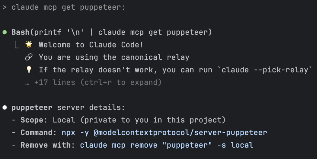 claude mcp add-json -s user puppeteer '{ "command": "npx", "args": ["-y", "@modelcontextprotocol/server-puppeteer"]}'使用 -s user 标志,可以将 MCP 服务器添加到全局配置(可以在 ~/.claude.json 文件中查看),而不是只针对某个项目,默认不填为 local 即当前项目。